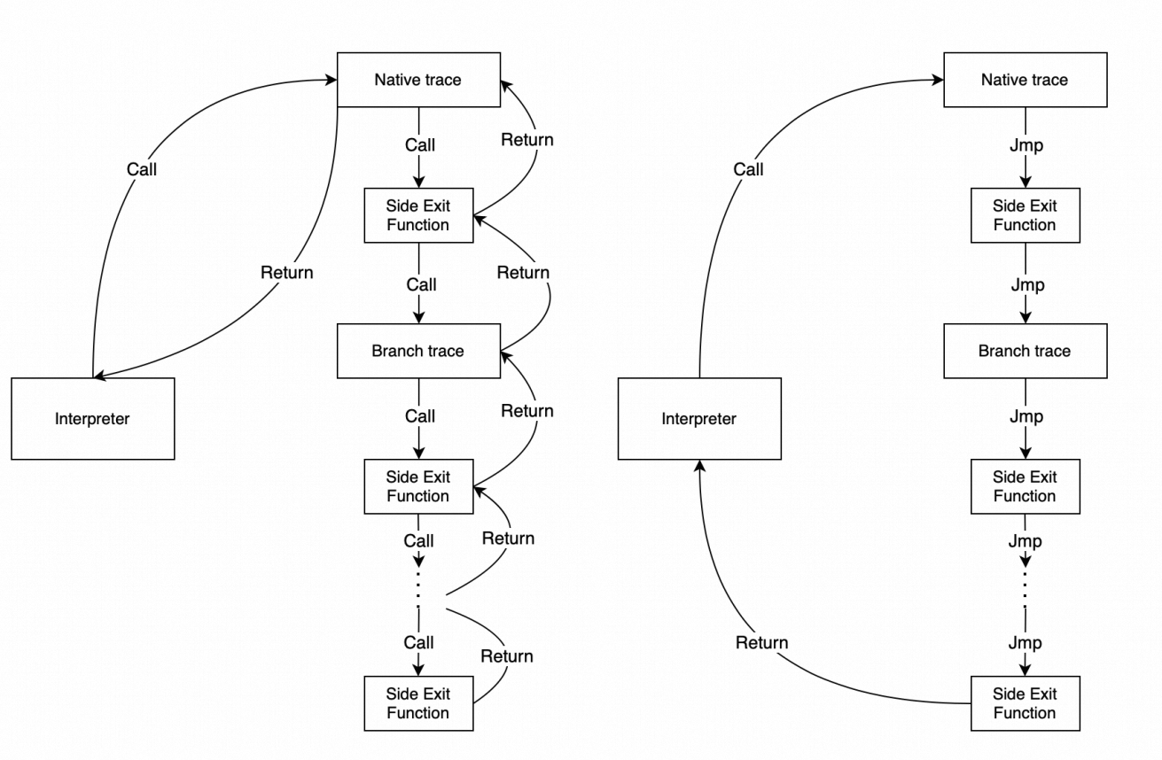 traces 用于存储所有跳出点的 native code 地址,用于实现 Trace Stitching,简单的说就是当分支判断失败后,不要直接回到解释器,而是先看看这个退出点是否存在另一条热路径,若有则直接转移控制权。