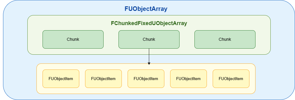 | extern COREUOBJECT_API FUObjectArray GUObjectArray; class FUObjectArray { typedef FChunkedFixedUObjectArray TUObjectArray; TUObjectArray ObjObjects; };